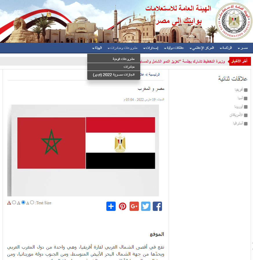 و في تطرقها للعلاقات التي تجمع بين مصر و المغرب ، كتبت الهيئة العامة للإستعلامات المصرية : ” المغرب تقع في أقصى الشمال الغربي لقارة أفريقيا، وهي واحدة من دول المغرب العربي ويحدّها من جهة الشمال البحر الأبيض المتوسط، ومن الجنوب دولة موريتانيا، ومن جهة الغرب المحيط الأطلسي، ومن الشرق تحدها دولة الجزائر”.