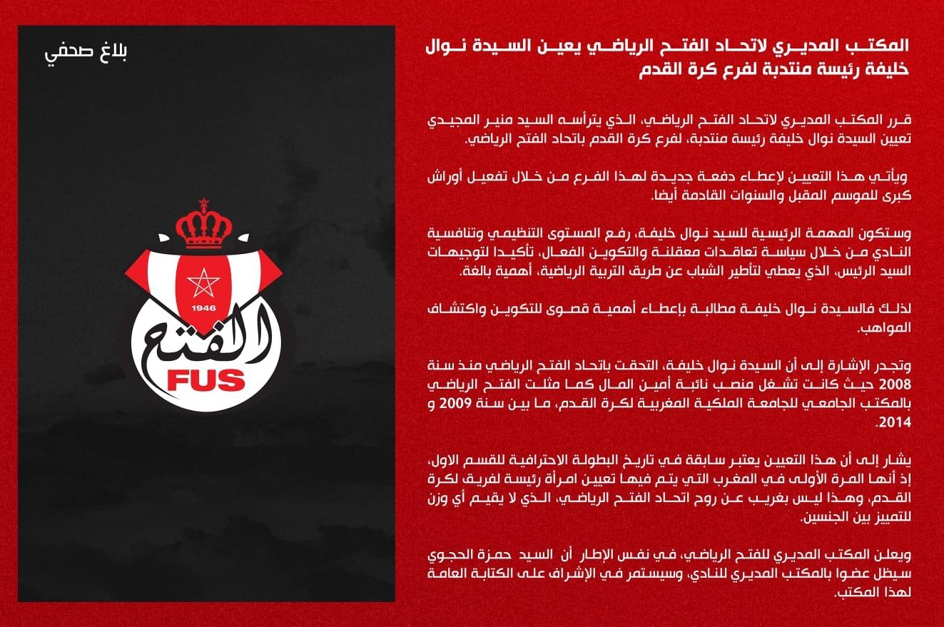 أعلن المكتب المديري لاتحاد الفتح الرياضي، بعد زوال اليوم الأربعاء، عبر بلاغ نشره على موقعه الرسمي، أنه قرر تعيين نوال خليفة، على رأس فرع كرة القدم خلفا لحمزة الحجوي، في سابقة تاريخية بالبطولة الاحترافية 1.