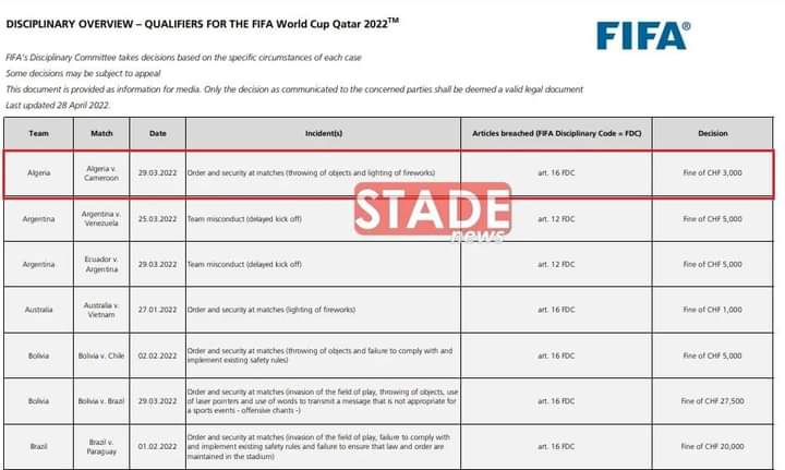اصدرت الفيفا عقوبات تأديبية بخصوص بعض مباريات تصفيات كأس العالم FIFA قطر2022، من بينها مباراة منتخبي الجزائر و الكاميرون.