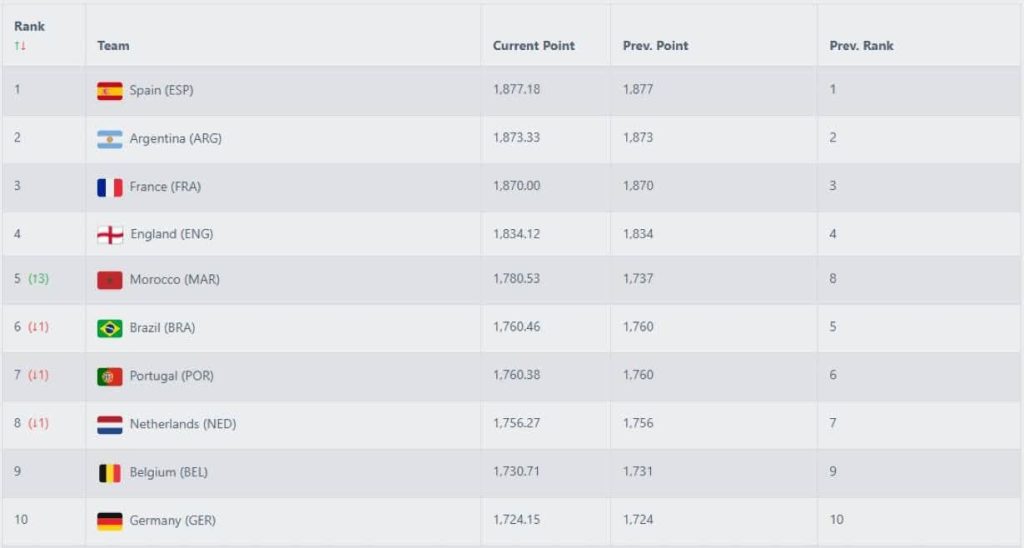 وفق آخر تحديث رسمي من الفيفا للتصنيف العالمي للمنتخبات، حل المنتخب المغربي في المرتبة الخامسة.