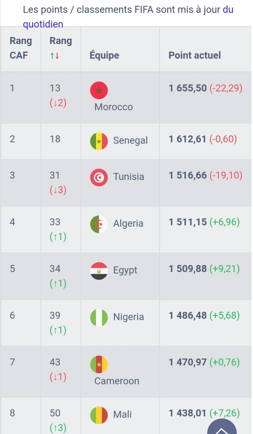 وحافظ المنتخب السنغالي على مركزه 18 دوليا، بالرغم من أنه فقد 0.60، فيما تراجع المنتخب التونسي إلى المركز 31 بعدما كان يحتل الصف 28، في الوقت الذي صعد فيه المنتخب المصري بمركز واحد، بعد انتصاره على غينيا، وتأهله رسميا إلى كأس إفريقيا، ليصبح في الرتبة 34 بما مجموعه 1509.88، بعدما أضاف لرصيده 9.21، بينما صعد المنتخب الجزائري هو الآخر بمركز واحد، حيث أصبح يحتل الصف 33، والمنتخب الإيفواري بستة مراكز.