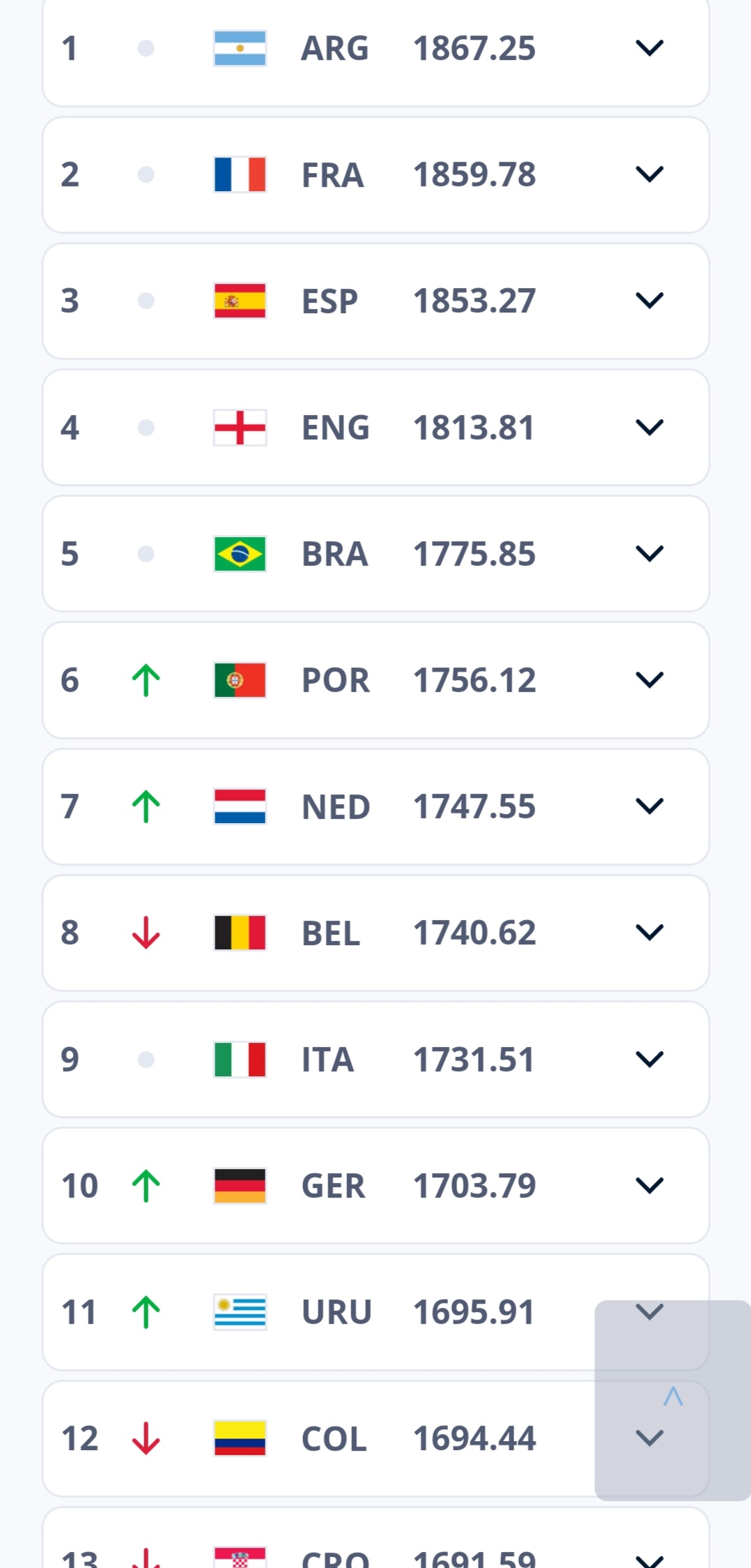 وعلى مستوى العشر الأوائل، حافظ المنتخب الأرجنتيني على صدارة التصنيف، رغم فقدانه ل16.25 نقطة، في الوقت الذي صعد فيه المنتخب البرتغالي والهولندي بمركز، ليصبح الأول في الصف السادس بما مجموعه 1756.12، والثاني في الرتبة السابعة برصيد 1757.55 نقطة، بينما تراجع المنتخب البلجيكي بمركزين، وصعود ألمانيا بمركز واحد.