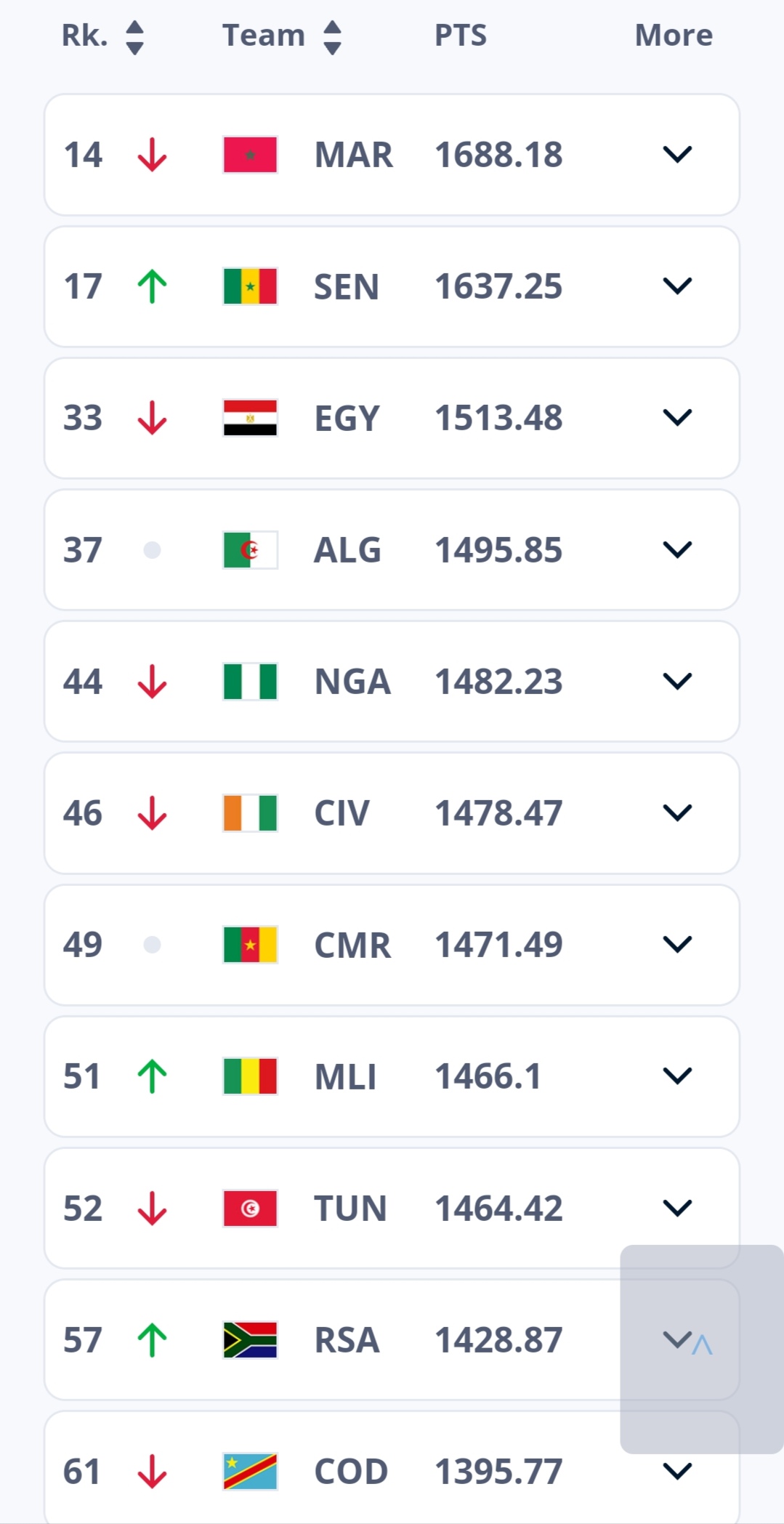 وفي السياق ذاته، تراجع المنتخب التونسي بستة مراكز، حيث أصبح في الرتبة 52، بما مجموعه 1464.42، فيما صعد منتخب مصر بثلاثة مراكز، ليصبح في الصف 33، بينما تراجع نيجيريا بعشرة مراكز كاملة، وكوت ديفوار بخمسة صفوف، مقابل صعود جنوب إفريقيا بثلاث رتب، والسنغال برتبتين.