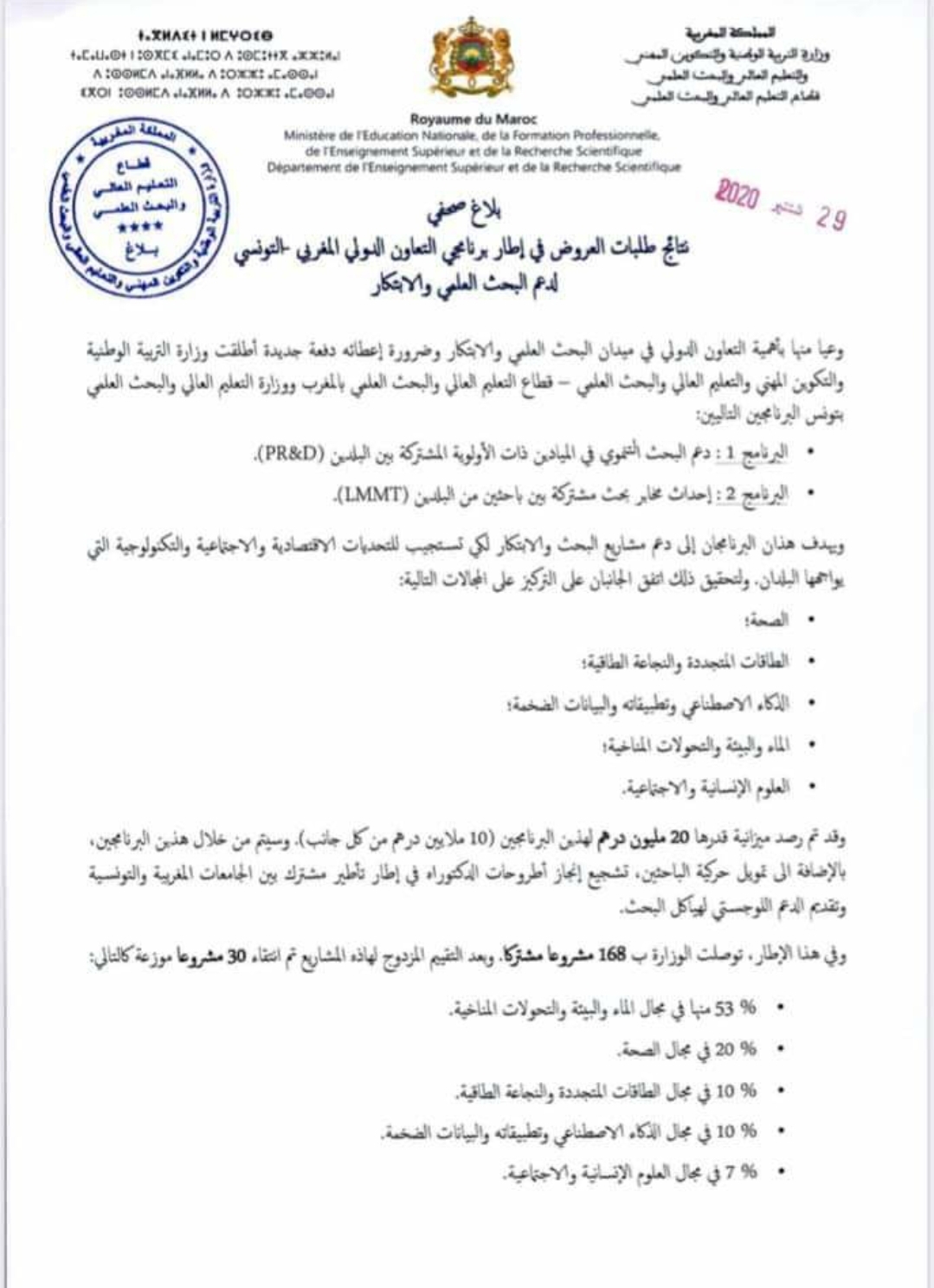 وقد توصلت الوزارة بما مجموعه 168 مشروعا مشتركا، وبعد التقييم المزدوج لهذه المشاريع تم انتقاء 30 مشروعا، % 53 منها في مجال الماء والبيئة والتحولات المناخية، و% 20 في مجال الصحة، و% 10 في مجال الطاقات المتجددة والنجاعة الطاقية، و% 10 في مجال الذكاء الاصطناعي وتطبيقاته والبيانات الضخمة، و% 7 في مجال العلوم الإنسانية والاجتماعية.