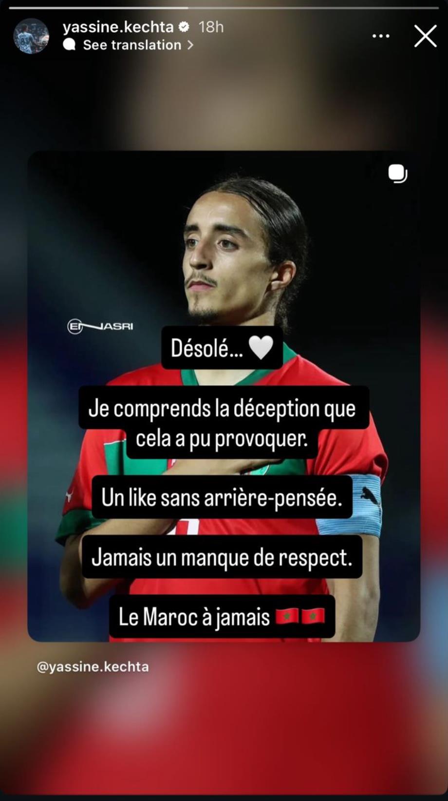 بدوره، قدم ياسين كشتة اعتذاره، مؤكدا تفهمه لخيبة الأمل التي قد يكون تسبب فيها هذا التصرف، موضحا أن الإعجاب كان بدون أي نية خفية أو إساءة، ومجددا ارتباطه الدائم بالمغرب.