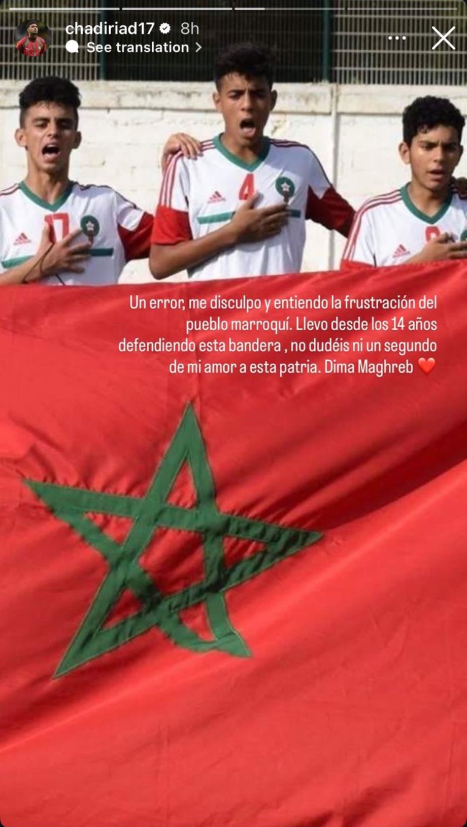 من جهته، عبر شادي رياض عن أسفه، معترفا بأن ما وقع كان خطأ، ومؤكدا تفهمه لإحباط الجماهير المغربية. كما شدد على حبه الكبير للوطن، مذكرا بأنه دافع عن ألوان العلم المغربي منذ سن الرابعة عشرة، وختم رسالته بعبارة “ديما المغرب”.
