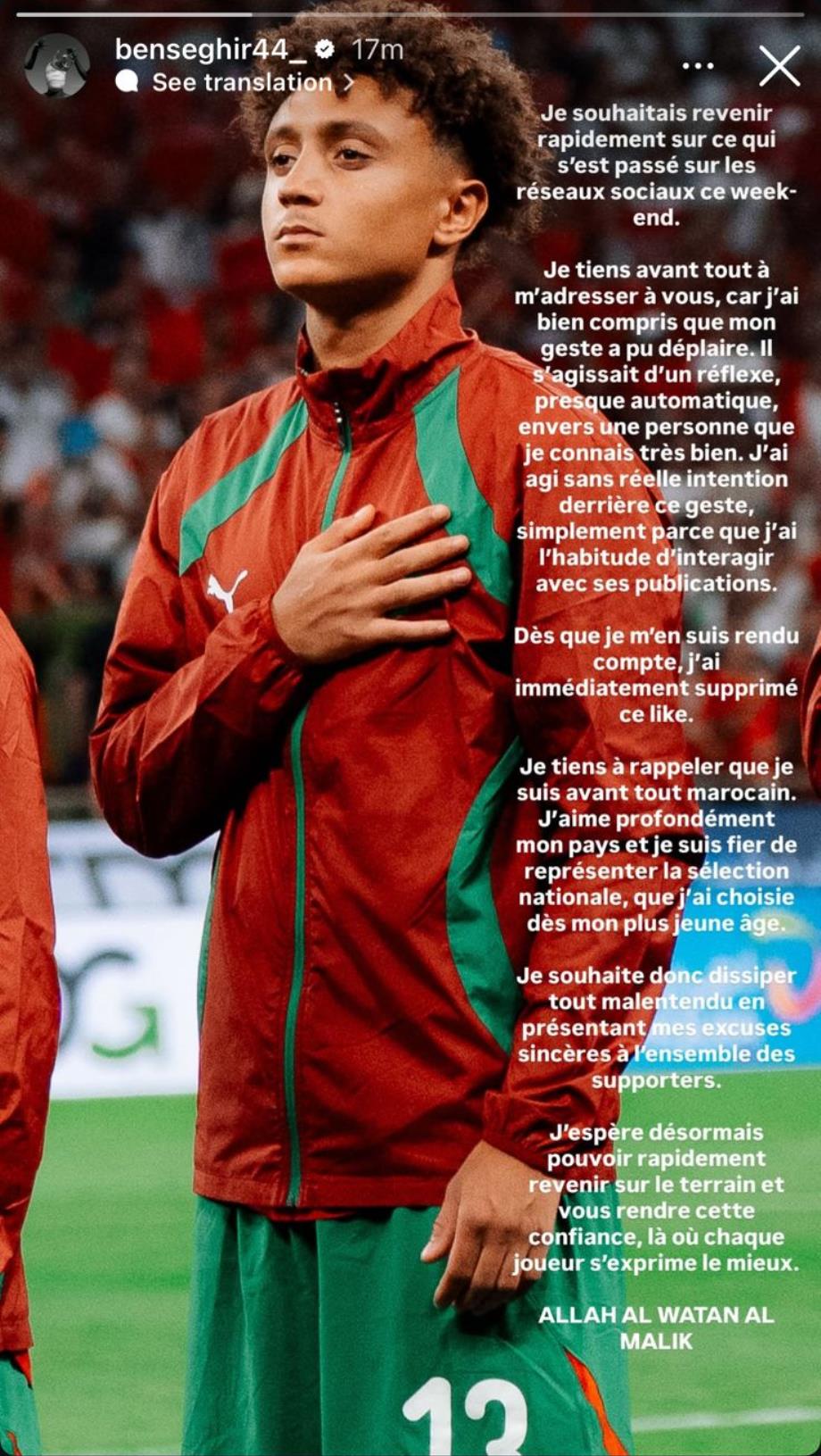 في هذا السياق، أوضح إلياس بن صغير أن ما حدث كان رد فعل لا إرادي تجاه منشورات لشخص يعرفه، مؤكدا أنه لم تكن لديه أي نية مسبقة، وأنه حذف الإعجاب فور إدراكه للأمر. وشدد على اعتزازه الكبير بمغربيته، قائلا إنه يفتخر بتمثيل المنتخب الوطني الذي اختاره منذ صغره، مقدماً اعتذاره للجماهير ومتمنيا العودة سريعا إلى الميدان لاستعادة ثقتهم.