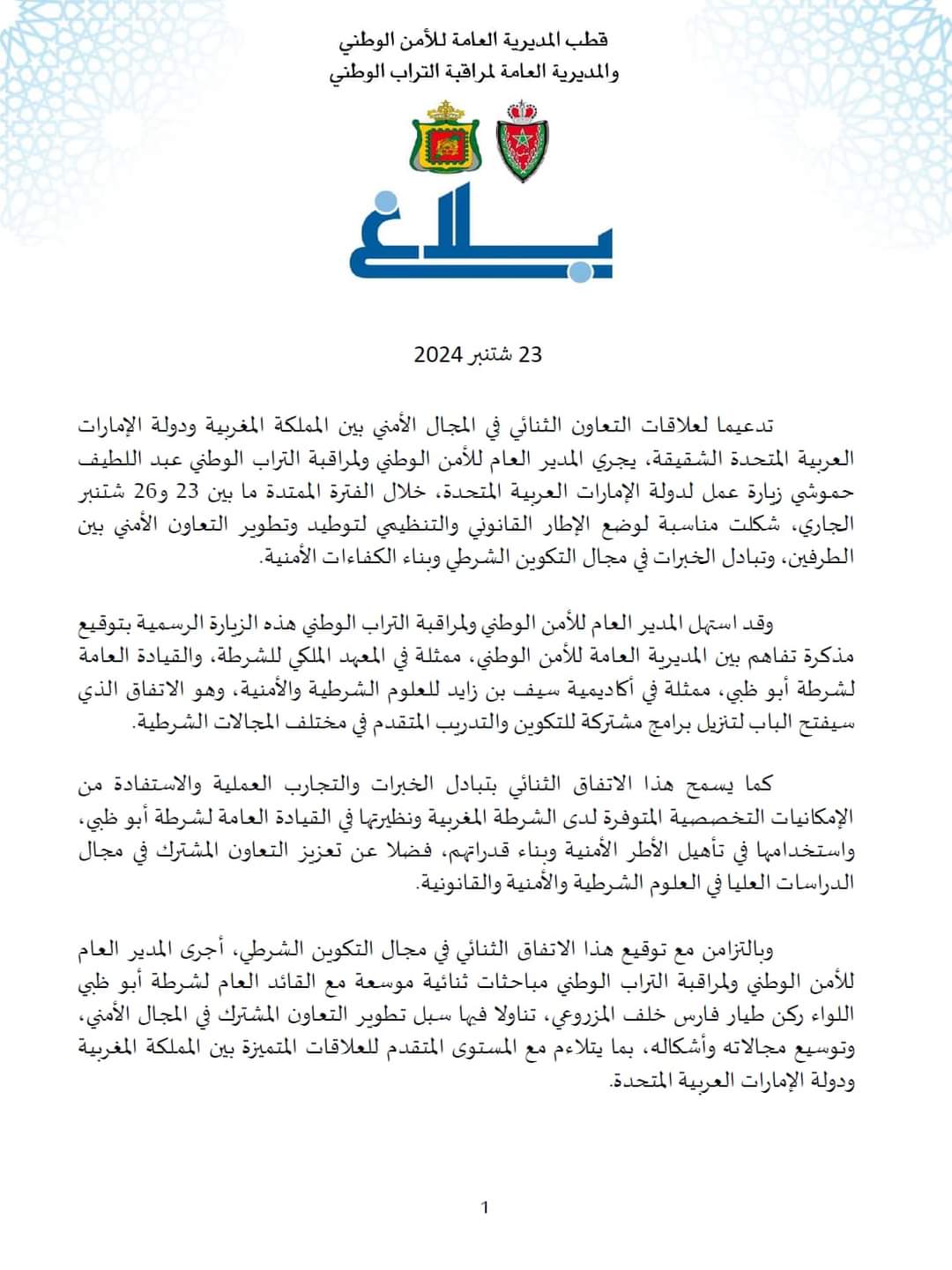 ذكر بلاغ لقطب المديرية العامة للأمن الوطني والمديرية العامة لمراقبة التراب الوطني أن المدير العام للأمن الوطني ولمراقبة التراب الوطني استهل هذه الزيارة الرسمية بتوقيع مذكرة تفاهم بين المديرية العامة للأمن الوطني، ممثلة في المعهد الملكي للشرطة، والقيادة العامة لشرطة أبو ظبي، ممثلة في أكاديمية سيف بن زايد للعلوم الشرطية والأمنية، وهو الاتفاق الذي سيفتح الباب لتنزيل برامج مشتركة للتكوين والتدريب المتقدم في مختلف المجالات الشرطية.