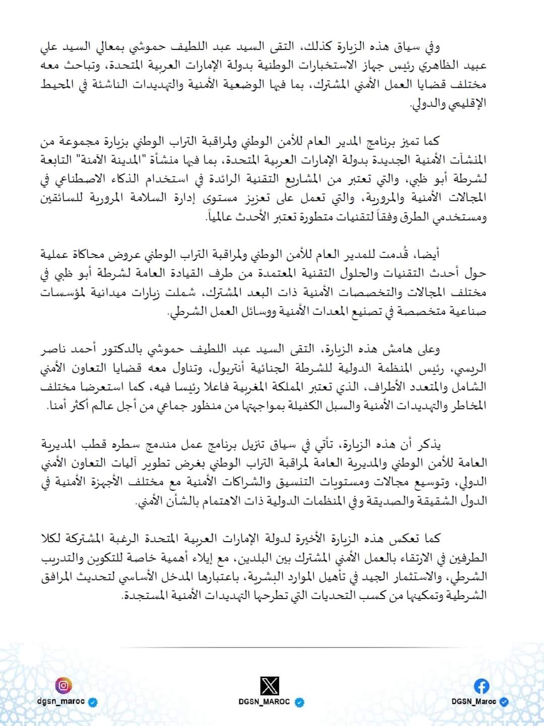زيارة المدير العام للأمن الوطني ولمراقبة التراب الوطني لدولة الإمارات هي تنزيل لبرنامج عمل مندمج يروم تعزيز الشراكات الأمنية.