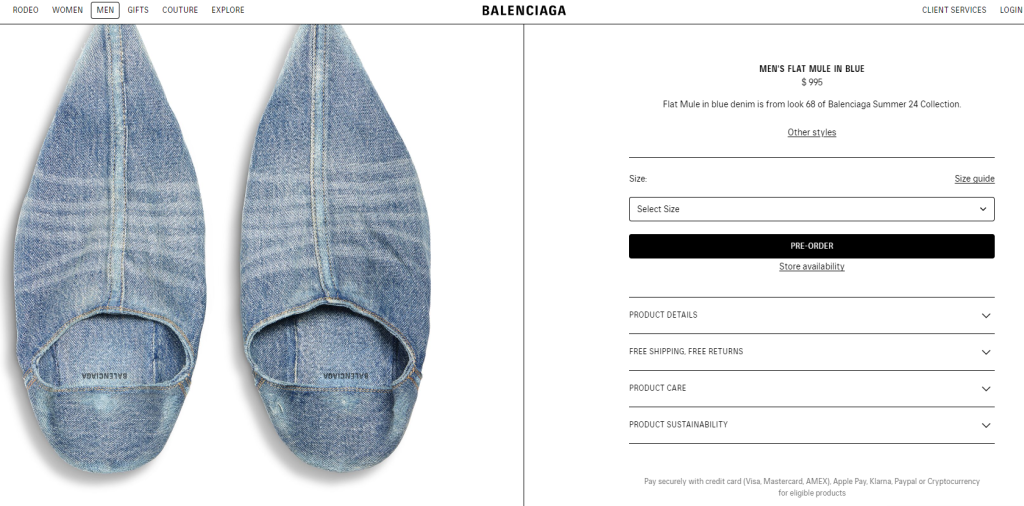 و أطلقت دار الأزياء الفرنسية الشهيرة، أصنافا متنوعة من البلغة المغربية لصيف 2024، بأشكال مغايرة و عليها توقيع بالنسياغا مقابل سعر يصل إلى 995 دولار اي ما يعادل مليون سنتيم مغربي.