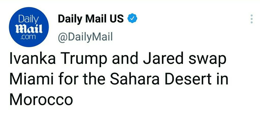 كشفت صحيفة “دايلي ميل” البريطانية، أن إيفانكا ترامب، نجلة الرئيس الالمريكي السابق، اختارت هي وزوجها قضاء عطلتهما بالصحراء المغربية بدل صحراء فلوريدا الأمريكية مكان إقامتهما.