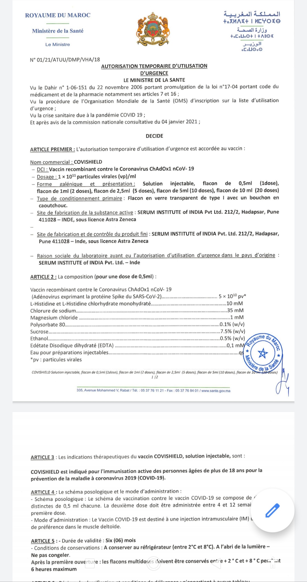 وحسب وثيقة رسمية حصلت عليها جريدة “الصحافة” الإلكترونية، فقد قررت وزارة الصحة المغربية، منح ترخيص مؤقت للاستعمال الاستعجالي للقاح مختبر أسترازينيكا، وسيسري الترخيص لمدة 12 شهرا ابتداء من 6 يناير 2021 ، ويحمل اللقاح الإسم التجاري كوفيشيلد.