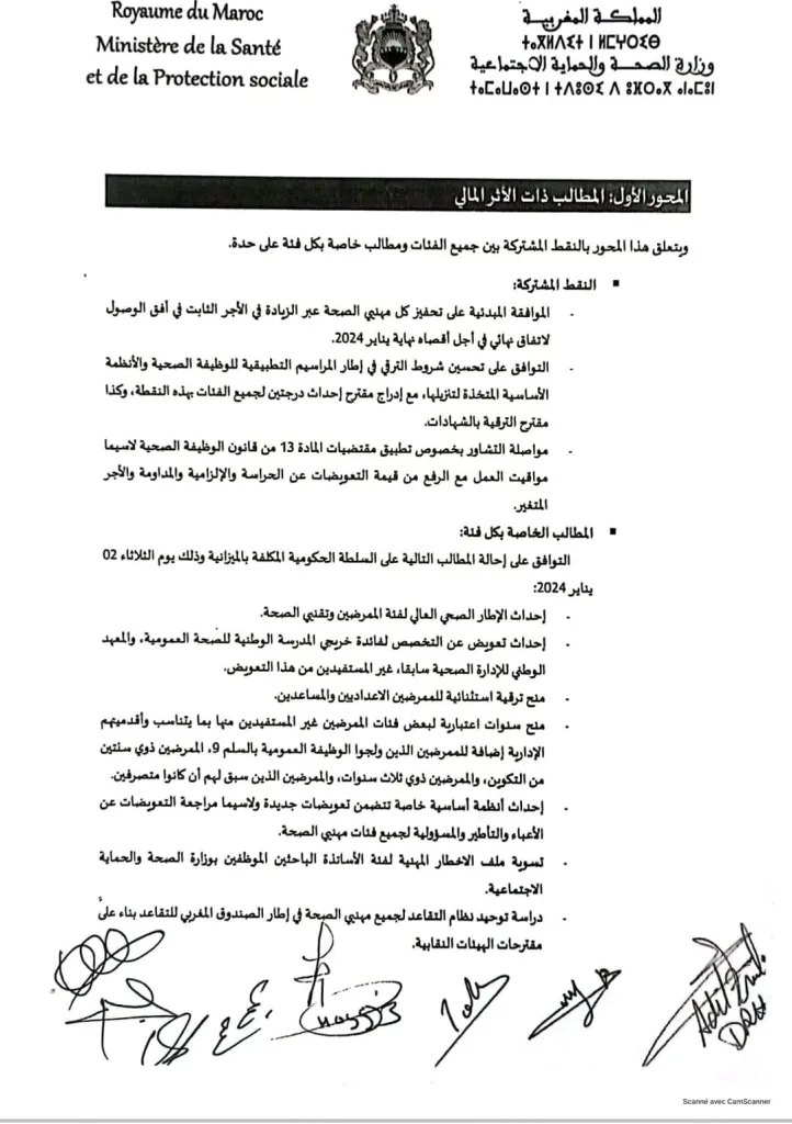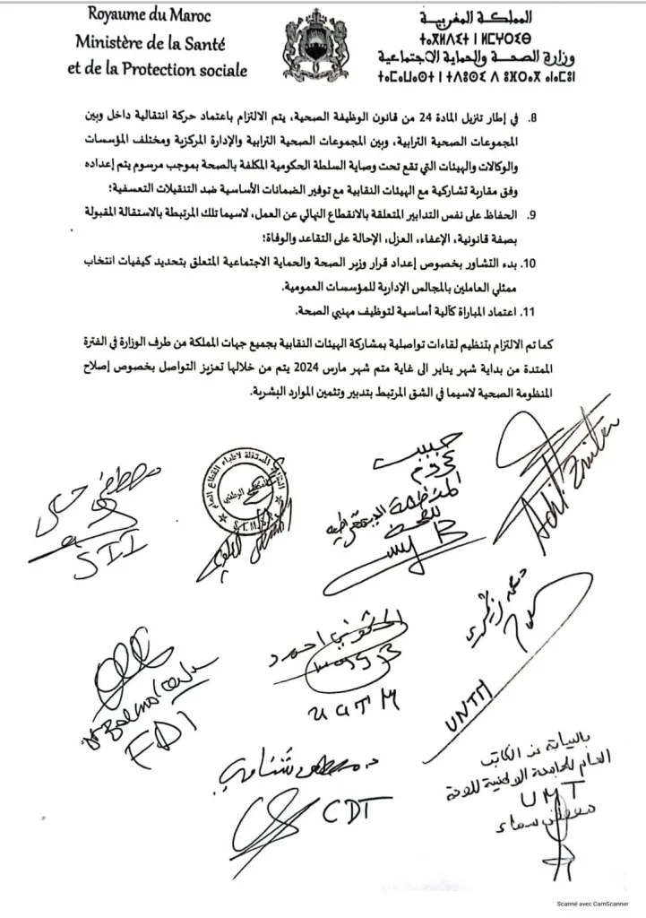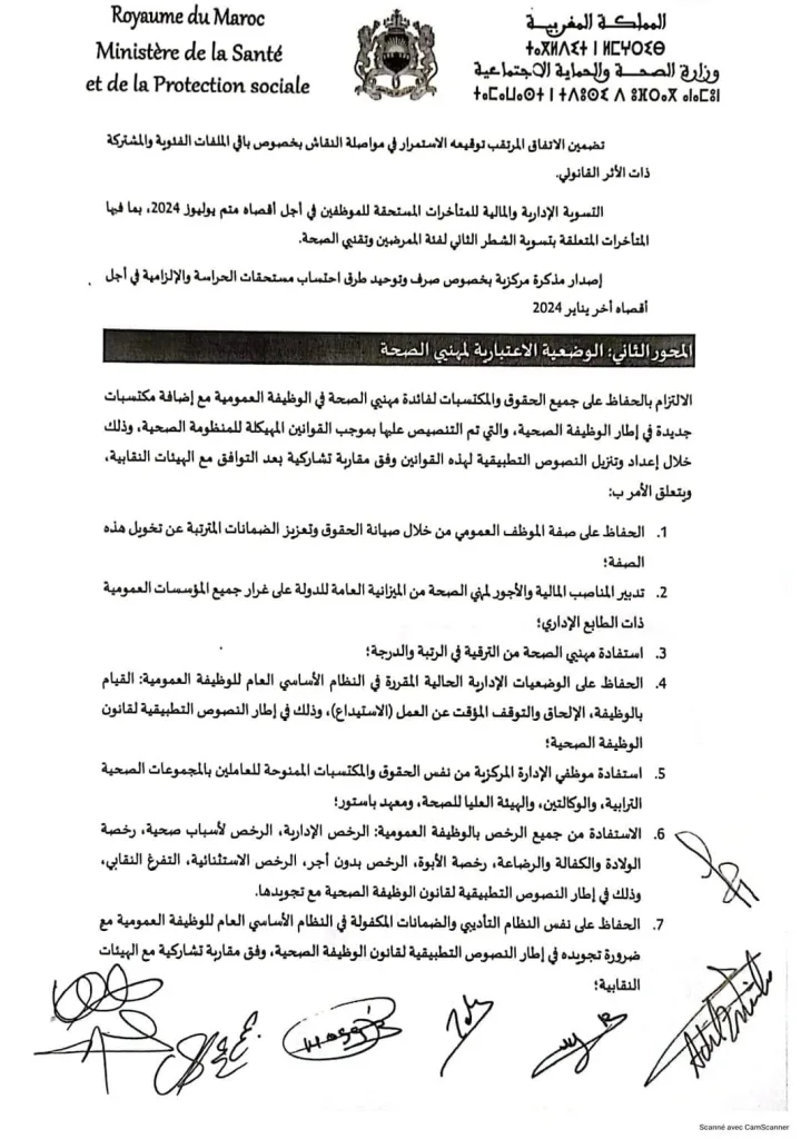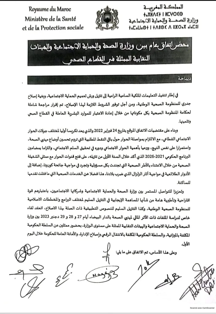 وقع اليوم بمقر وزارة الصحة ، محضر اتفاق عام بين وزارة الصحة و الحماية الإجتماعية وجميع الهيئات النقابية الممثلة في القطاع الصحي.