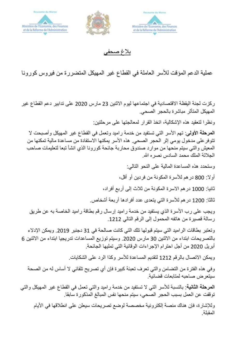 المرحلة الثانية: بالنسبة للأسر التي لا تستفيد من خدمة راميد والتي تعمل في القطاع غير المهيكل والتي توقفت عن العمل بسبب الحجر الصحي، سيتم منحها نفس المبالغ المذكورة سابقا.