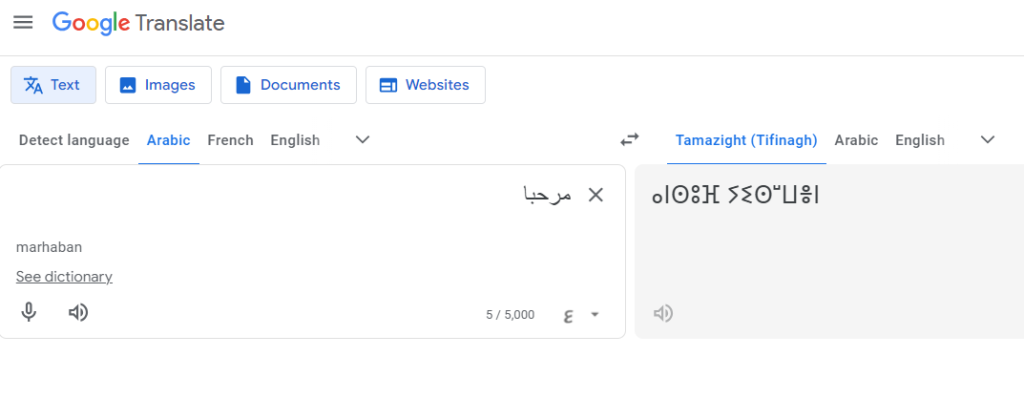 ويظهر خلال البحث في الترجمة على “غوغل” أن مستعملي هذه الخاصة قد صار بإمكانهم ترجمة نصوصهم بجميع اللغات من أو إلى اللغة الأمازيغة بحروف تيفناغ.