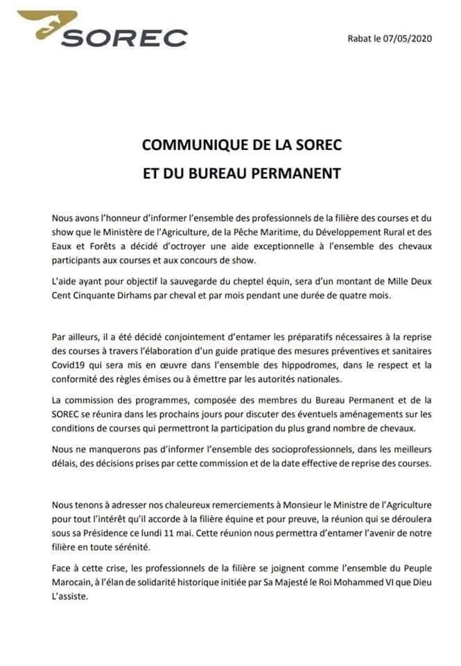 ووفقا للبلاغ نفسه، فقد شرعت الشركة الملكية لتشجيع الفرس، في وضع الترتيبات اللازمة لاستئناف سباقات الخيل المغربية، وذلك عن طريق بلورة خطة محكمة تشمل أخذ كل الاحتياطات والتدابير اللازمة بكافة حلبات السباق بالمملكة، وفق المعايير التي حددتها المصالح الوطنية لمحاربة وباء “كوفيد-19”.