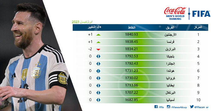 أعلن الاتحاد الدولي لكرة القدم “الفيفا”، صباح اليوم الخميس 6 أبريل، عن التصنيف العالمي الجديد للمنتخبات، والذي عرف سقوط المنتخب البرازيلي من صدارة الترتيب بعد هزيمته التاريخية أمام المنتخب المغربي.