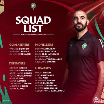 وتضم لائحة اللاعبين التي كشف عنها وليد الركراكي، يومه الخميس 29 غشت 2024 خلال الندوة الصحافية التي عقدها بمركب محمد السادس لكرة القدم 26 لاعبا ويتعلق الأمر بكل من :