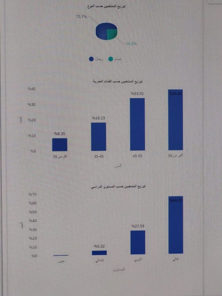أما الفئة أقل من 35 سنة، فلا تتعدى 8.35 في المائة. وبخصوص المستوى الدراسي، فإن 66.33 في المائة من نواب المجلس المنتخبين، مستواهم التعليمي عالي، فيما يمثل الحاصلون على مستوى التعليم الثانوي نسبة 27.59 في المائة. أما الذين مستواهم الدراسي ابتدائي فلا تتعدى نسبتهم 5.32 في المائة.