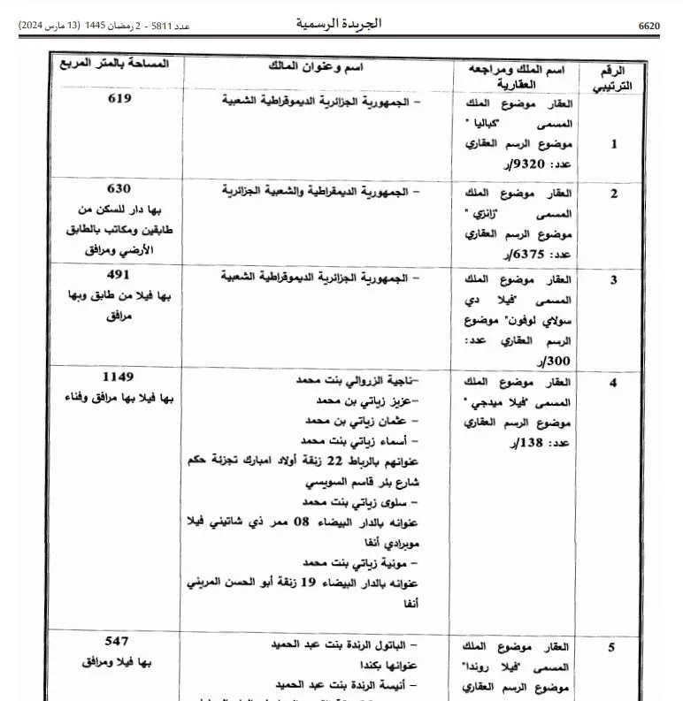 و يتعلق الأمر بعقار يسمى “كباليا” موضوع الرسم العقاري 9320/ر، مساحته 619 مترا مربعا، أما العقار الثاني فهو موضوع الملك المسمى “زانزي” موضوع الرسم العقاري 6375/ر، مساحته 630 مترا، يشمل دارا للسكن من طابقين ومكاتب بالطابق الأرضي ومرافق، أما العقار الثالث فهو “فيلا دي سولاي لوفون” موضوع الرسم العقاري 300/ر، وبها فيلا من طابق و مرافق.