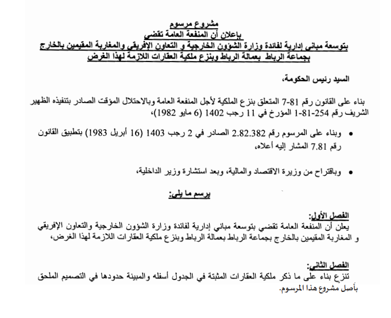 و حسب قرار الحكومة المغربية الذي نشر بالجريدة الرسمية ، فإن مصادرة العديد من العقارات والأراضي التابعة للدولة الجزائرية في العاصمة يأتي لأغراض توسعة مباني إدارية لفائدة وزارة الشؤون الخارجية والتعاون باقتراح من وزيرة الاقتصاد والمالية و استشارة وزير الداخلية.