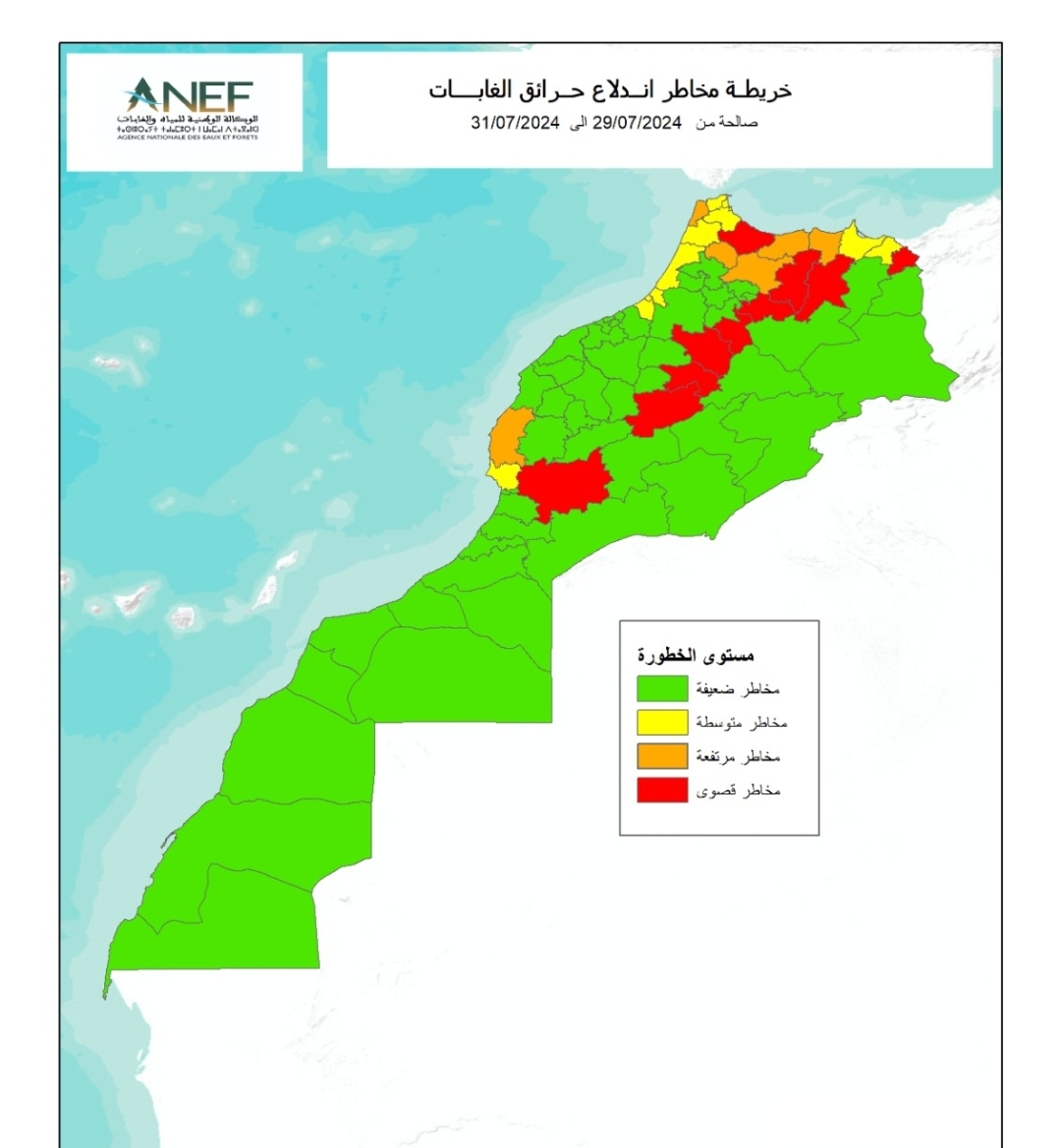 من أجل استباق حرائق الغابات على الصعيد الوطني، تصدر الوكالة الوطنية للمياه والغابات، بشكل يومي، خرائط تنبؤ تحدد بدقة المناطق الحساسة والمعرضة لخطر اندلاع الحرائق الغابوية، وابتداء من يوم الاثنين 29 يوليوز 2024 إلى يوم الاربعاء 31 يوليوز 2024 وبعد تحليل البيانات المتعلقة خصوصا ب: