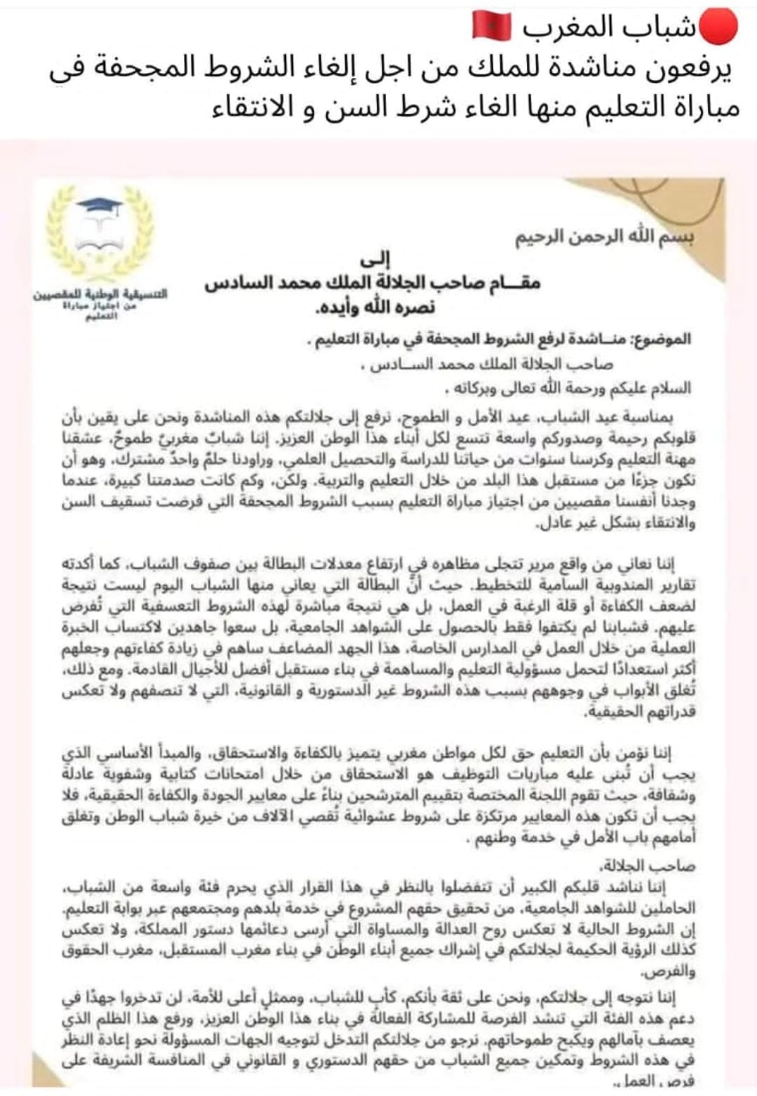 إننا نناشد قلبكم الكبير أن تتفضلوا بالنظر في هذا القرار الذي يحرم فئة واسعة من الشباب، الحاملين للشواهد الجامعية، من تحقيق حقهم المشروع في خدمة بلدهم ومجتمعهم عبر بوابة التعليم. إن الشروط الحالية لا تعكس روح العدالة والمساواة التي أرسى دعائمها دستور المملكة، ولا تعكس كذلك الرؤية الحكيمة لجلالتكم في إشراك جميع أبناء الوطن في بناء مغرب المستقبل، مغرب الحقوق والفرص.